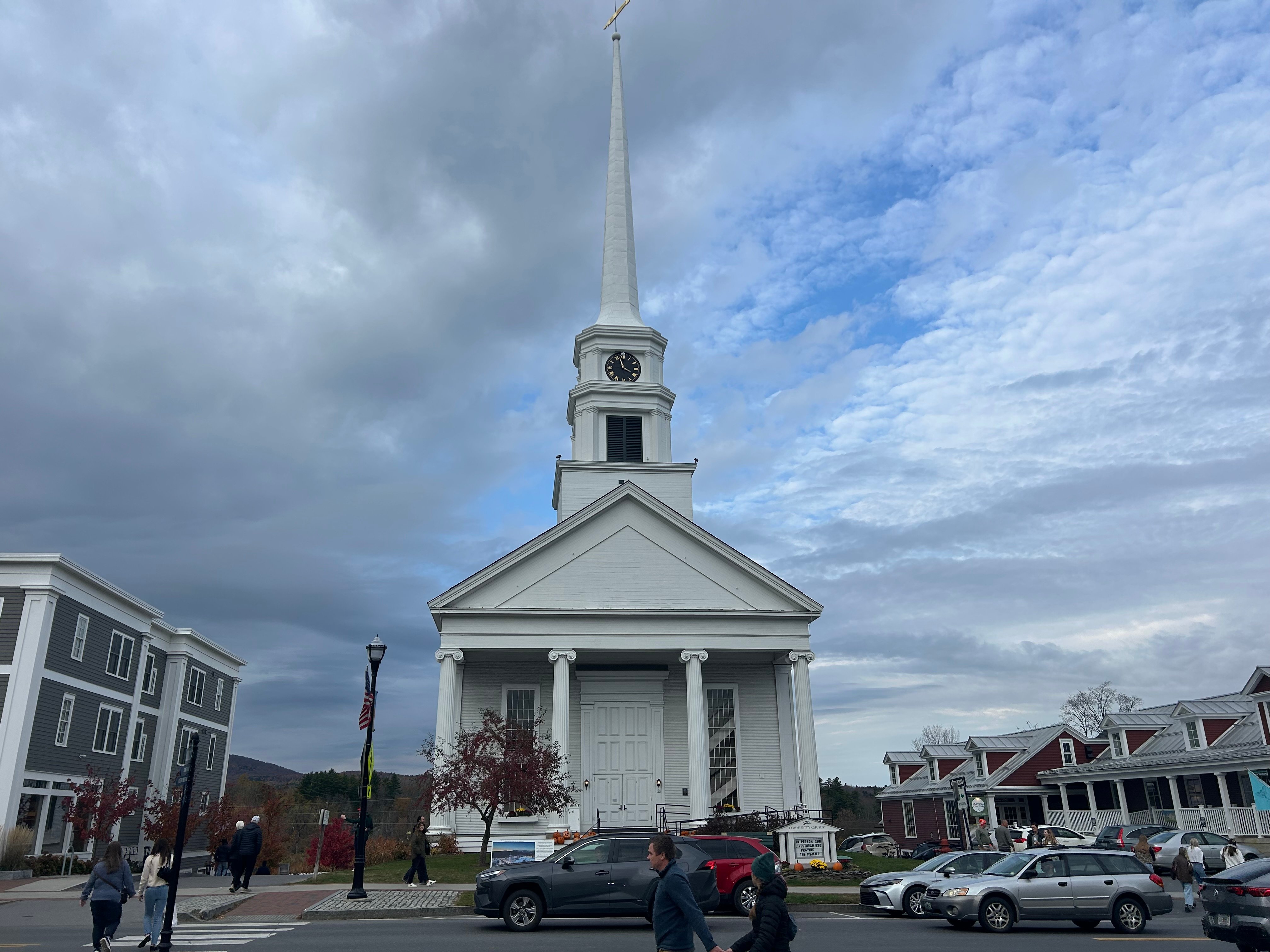 We started our exploration of Stowe with a visit to the Community Church. The landmark, built in the classic New England colonial style, is synonymous with the town, as its origins trace back to 1863. We found the best view of the structure to be closer to the public parking lot near the town entrance because from that vantage point, the church is set aglow by the distant tree-lined horizon.