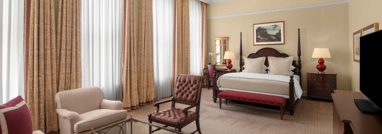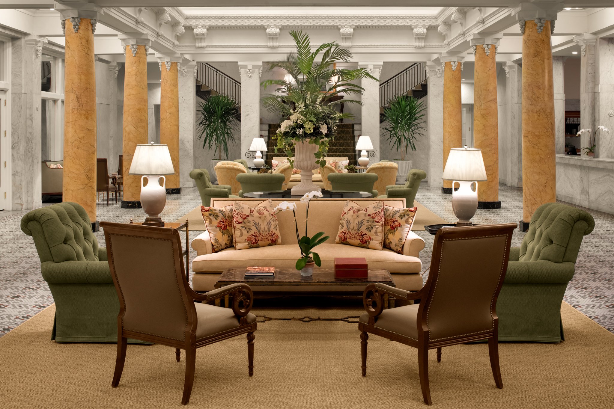 Luxurious. From the moment I entered the lobby I felt like I was stepping back in time. The stunning space welcomed me with soaring ceilings, intricately tiled floors and marble columns. Warm earth tones, plush seating and pops of green foliage create a relaxed, elegant style. Don’t forget to look up to see the stained-glass skylight, a crown jewel in the hotel’s interior.
