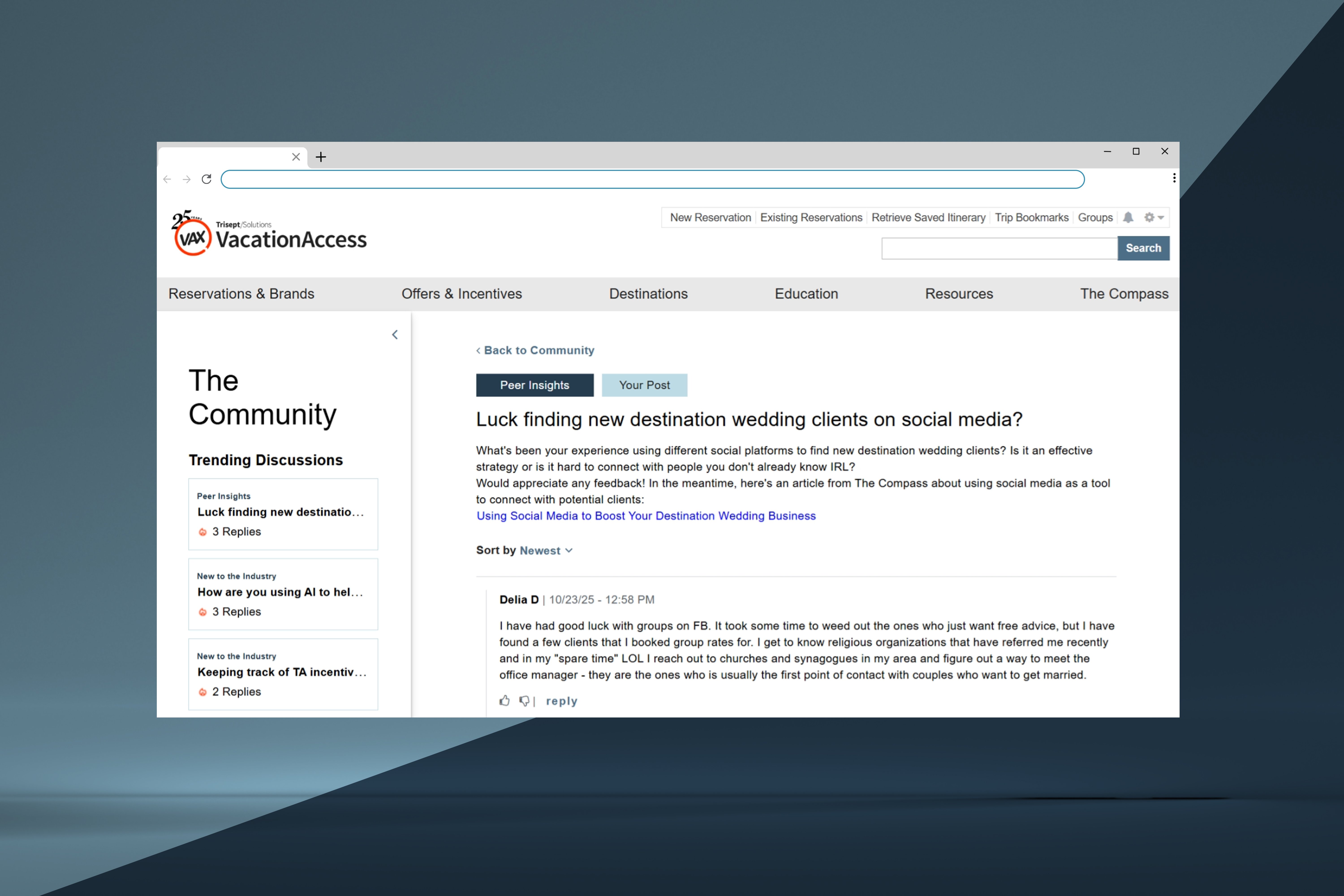 Visit www.vaxvacationaccess.com/community or navigate to Community & Resources in VAX’s main menu and choose Community from the dropdown.