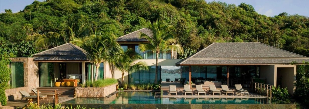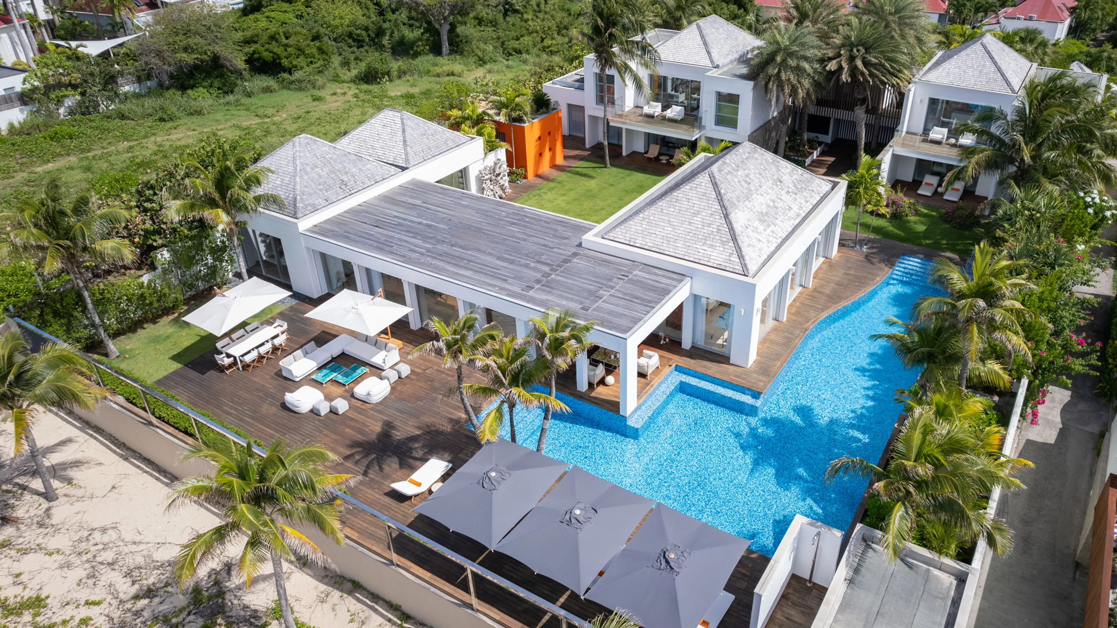 This five-bedroom, five-bathroom villa, perfect for multi-generational families or groups of friends, sits directly on the sands of Flamands Beach offering stunning views of the Caribbean Sea. The villa features bedrooms with queen-size beds, en-suite bathrooms, and private terraces, including a small pool on one terrace for added serenity. The interior showcases contemporary Caribbean design with natural light flooding the open living spaces, complemented by a fully-equipped kitchen, stylish dining area, and a bar opening to the terrace. Outdoor amenities include a heated pool, sun loungers, and an outdoor dining area, all framed by lush gardens and swaying palms. The villa comes with a dedicated staff, including housekeepers and pool maintenance, with additional staff such as a private chef, butler, or driver available upon request. Ideal for a refined 10-guest getaway, this villa is the perfect escape to feel St. Bart’s island charm. Ana Flamands can be viewed here.