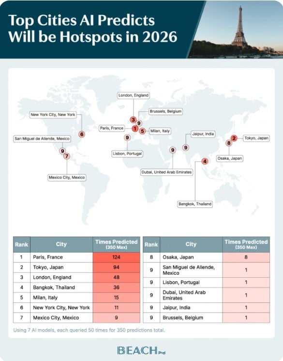 Ready your berets and baguettes because, as the top predicted city for 2026 travel, vacations to Paris are about to have a moment. In reference to these findings, Beach.com said no other global city came close to Paris as, upon asking each of the seven generative AI models to predict the top destination for travel in the new year, Paris took the cake finishing first in 124 of 350 model runs (35%). In a distant second place was Tokyo, which snagged the number one spot in 94 forecasts (27%), while London secured bronze with 48 first-place predictions.