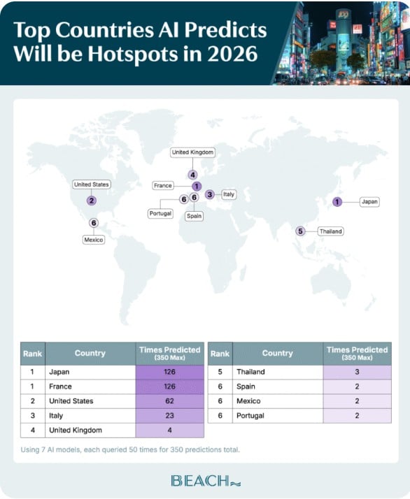 In addition to cities, Beach.com asked the AI models to predict the top country destinations for 2026, and the results were neck-and-neck with Japan and France tying for the number one spot. “Both countries came out on top 126 times (36% each). With only 350 total forecasts, only a few top spots are (left) for other countries,” said Beach.com. At the end of the day, the U.S., Italy and the United Kingdom each earned a place at the podium ranking 18%, 7% and 1%, respectively. While other contenders for trending countries in 2026 were Thailand, Spain, Mexico and Portugal.