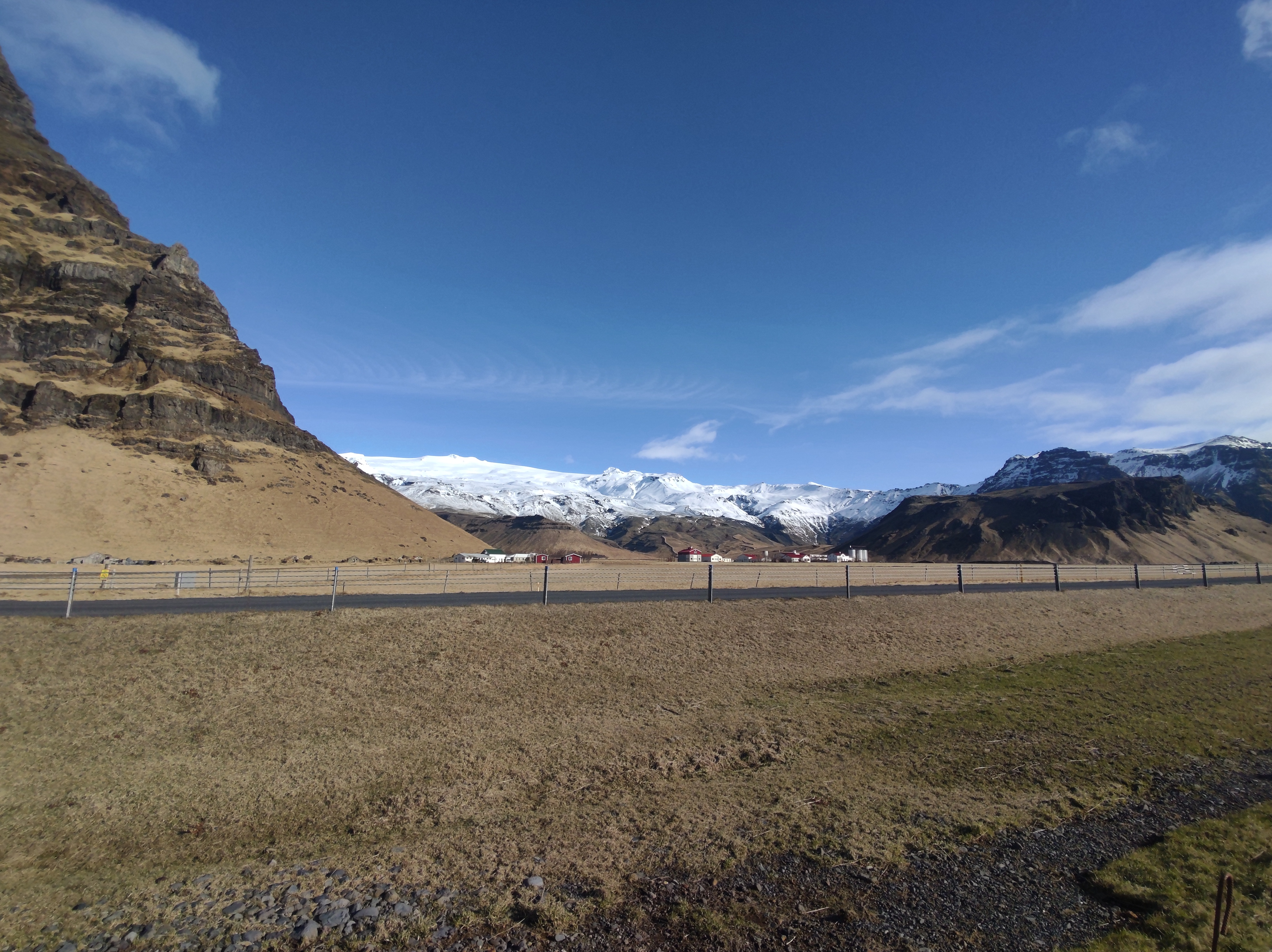 Thanks to exceptionally nice weather, our South Coast tour kicked off with a bonus stop at Eyjafjallajökull, an ice cap that sits atop the caldera of an active volcano. If the name sounds familiar, it’s probably because this region made headlines in 2010 when the volcano erupted and caused major disruptions to air travel for nearly a week. Our visit here was short and sweet at just 10 minutes long, allowing us enough time to read some signage and snap photos of the ice cap from across the street. Upon returning to the van, our guide taught us how to pronounce Eyjafjallajökull’s challenging name — “ay-uh-fyaat-laa-yow-kl” — and shared his challenges learning the Icelandic language as a foreigner. Interestingly, he said Icelandic is a dying language and it’s incredibly difficult to find resources, whether that be native teachers or apps, to learn it.